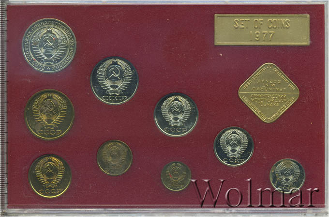 875 проходовГодовой набор 1977 ЛМД (Прозрачный футляр) „Годовой набор: 9 монет + 2 жетона“. |