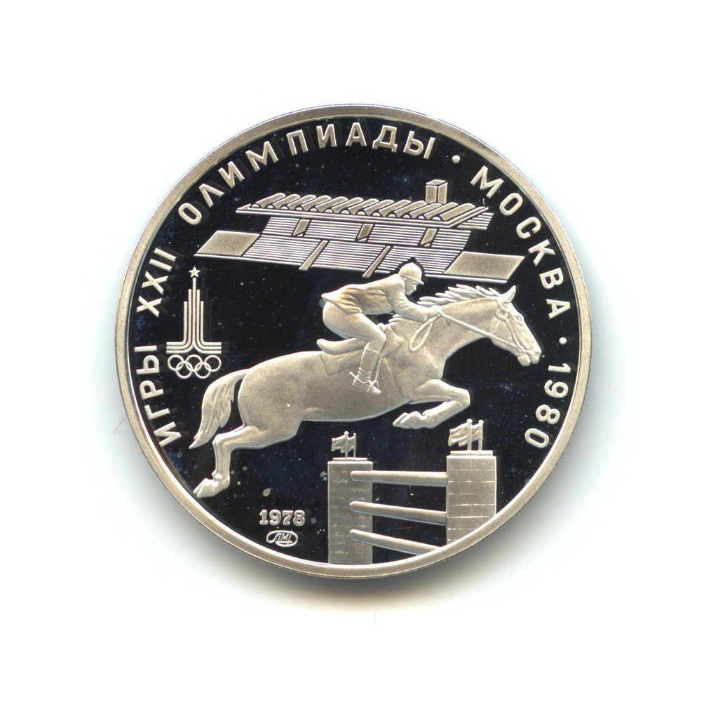 Динамика цен по монете 5 рублей 1978 ЛМД „Игры XXII Олимпиады. Конный спорт: преодолевание барьера на лошади (Конкур)“ MSВыше: конный спортСерия: Спорт В 1980 году на XXII летних Олимпийских играх в Москве соревнования по конному спорту проводились в спортивном комплексе «Битца» и на Большой спортивной арене стадиона «Лужники». Участие в них принимали 68 наездников, представляющих 11 государств. Страны-лидеры прошлых олимпиад — США и ФРГ, не прислали своих спортсменов. Все золотые награды в командных соревнованиях получили конники СССР. При этом в индивидуальных турнирах им не удалось завоевать первые места. АверсГерб СССР, название государства разбито гербом на две части: СС-СР, внизу расположен, отделенный двойной чертой номинал.РеверсИзображение всадника, преодолевающего барьер на лошади на фоне ипподрома, внизу — год, по окружности надпись: «ИГРЫ XXII ОЛИМПИАДЫ. МОСКВА. 1980»Каталожные номера