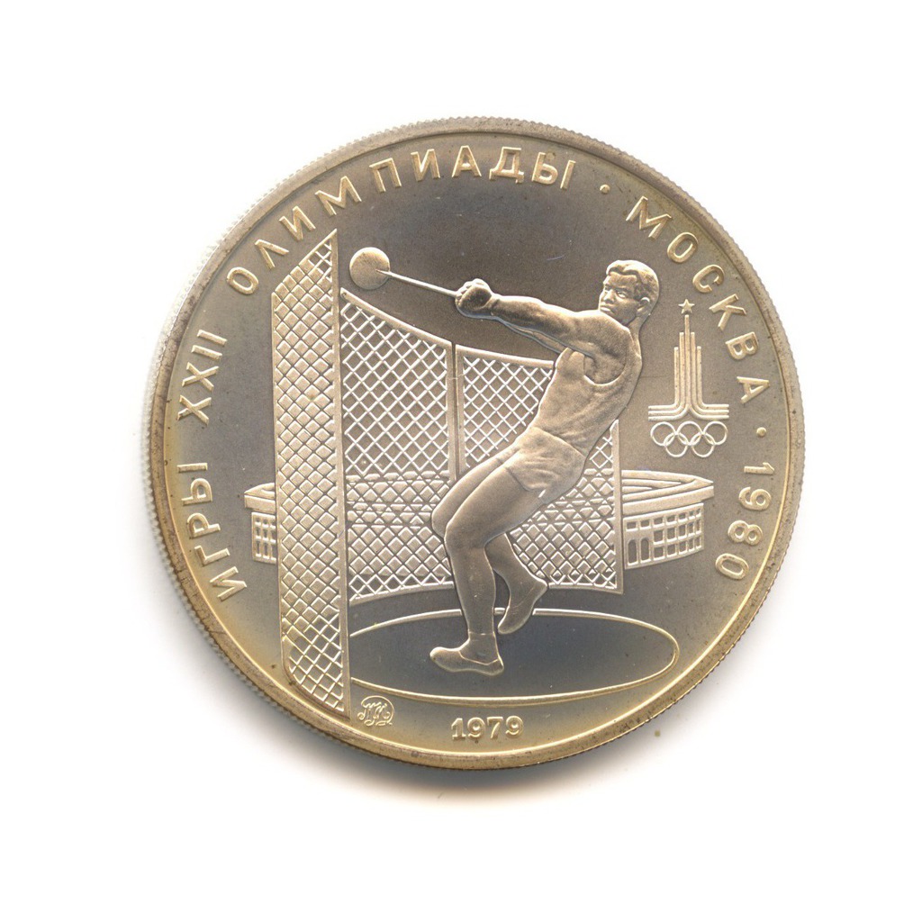 Динамика цен по монете 5 рублей 1979 ММД „Игры XXII Олимпиады. Метание молота“ PROOFСильнее: Метание молотаСерия: Спорт Главная цель соревнований — кинуть спортивный снаряд на максимальное расстояние. При броске ядро раскручивается с помощью прикрепленной к нему проволоки, соединенной с рукоятью. Масса снаряда составляет 7,265 кг (мужчины) и 4 кг (женщины). При этом метатель при броске должен находиться в круге диаметром 2,135 метров, покинуть который разрешается лишь после приземления ядра. Ядро при броске должно упасть в пределах определенного сектора (на данный момент угол его составляет 35°). В 1980 году на летних Олимпийских играх советские спортсмены очень хорошо показали себя в дисциплине «Метание молота (ядра)». Так, среди мужчин весь пьедестал почета заняли участники из СССР. АверсГерб СССР, название государства разбито гербом на две части: СС-СР, внизу расположен, отделенный двойной чертой номинал.РеверсИзображение атлета в секторе для метания молота в момент раскрутки молота перед броском, на заднем фоне изображение легкоатлетического стадиона, внизу год, по окружности надпись: «ИГРЫ XXII ОЛИМПИАДЫ МОСКВА. 1980»Каталожные номера