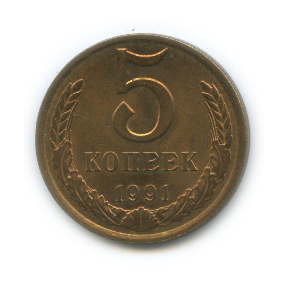 Динамика цен по монете 5 копеек 1991 Л MSРазменные монеты номиналом 5 копеек 1961 - 1991Пятикопеечная монета времен позднего периода существования СССР изготовлена в виде кружка из медно-цинкового сплава. По периметру она имеет гладкую, выступающую с двух сторон окантовку. Все изображения и тексты возвышаются над основной плоскостью дензнака. Аверс. Как и у прочих монет низшего номинала, лицевая сторона пятикопеечной монеты украшена гербом Советского Союза и текстом под ним в виде аббревиатуры СССР. Реверс. Вдоль внешнего канта расположен венок, собранный из ветвей дуба и колосков пшеницы. Внутри него помещен номинал в виде цифры и букв (5 копеек), а также дата чеканки под ним. Гурт у монетки рубчатый. Диаметр круга составляет 25 мм. Номинальный вес — 5 грамм. Общий тираж выпуска превысил 1 миллиард экземпляров. Для чеканки использовалось несколько разновидностей штампов — только аверс встречается в четырех вариантах. |