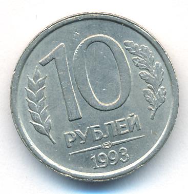 Динамика цен по монете 10 рублей 1993 ЛМД (Немагнитная) XF10 рублей 1993 года, ЛМДДата выпуска: 01.01.1993 АверсВ середине двуглавый орел с опущенными крыльями, перья с просечками, внизу надпись «БАНК РОССИИ».РеверсВ центре немного смещенная вверх цифра «10» обозначающая номинал монеты, ниже слово «РУБЛЕЙ», под ним монограмма монетного двора (ЛМД). Внизу у края монеты год выпуска «1993». Слева колос, справа дубовая ветвь.Каталожные номера