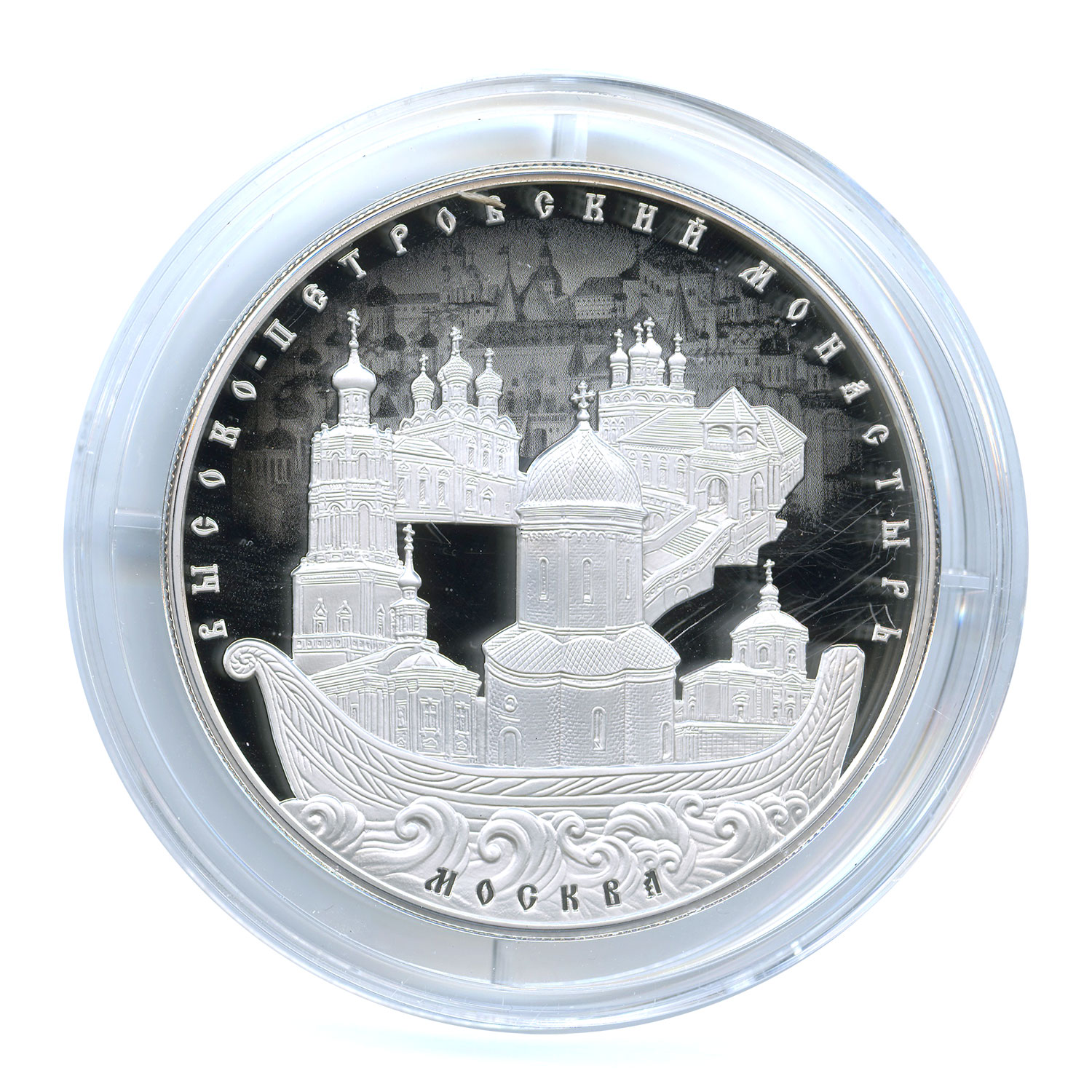 Динамика цен по монете 25 рублей 2015 - „Высоко-Петровский монастырь г. Москвы“ PROOFВысоко-Петровский монастырь города МосквыСерия: Памятники архитектуры России Высоко-Петровский монастырь в Москве был основан в XIV веке митрополитом Киевским, Московским и всея Руси Петром, который перенес митрополичью кафедру в Москву, возвышавшуюся в тот период как государственный и церковный центр Руси. Строительству и развитию монастыря содействовали князья Иоанн Калита и Димитрий Донской, великий князь Василий III, царь Алексей Михайлович Романов, император Петр I, митрополит Московский Филарет. Высоко-Петровский монастырь на улице Петровке — это уникальный историко-культурный комплекс и архитектурный ансамбль начала XVI — середины XVIII веков. Большинство его сооружений выполнено в стиле «нарышкинского (московского) барокко». В ансамбль монастыря входят: — Собор святителя Петра (1514 г.) — первый каменный (из красного кирпича) храм монастыря редкой столпообразной центрической формы высотой 23 метра; — Сергиевский храм (1694 г.) с массивным переходом на арке в корпус Братских келий. В 1702—1705 гг. его одноглавое завершение было переделано в пятиглавое; — Каменный Боголюбский собор, построенный в 1684—1690-х гг. по указу Петра I над могилами его дядьев Ивана и Афанасия Нарышкиных, убитых во время стрелецкого бунта в 1682 г. Позже храм стал местом упокоения более 20 представителей рода Нарышкиных, в том числе деда и бабки Петра I. Вокруг храма располагался некрополь обители; — Храм Толгской иконы Божией Матери построен одним из последних в обители (1774−1750 гг.) и завершает архитектурный ансамбль центральной части монастыря со стороны улицы Петровка. Он был построен на средства родни императора Петра I по Нарышкинской линии; — Святые врата монастыря с надвратным храмом в честь Покрова Пресвятой Богородицы и ажурной двухъярусной колокольней над ним возведены царем Петром I в 1690 г. в память о погибших Иване и Афанасии Нарышкиных. В 1996 г. надвратный Покровский храм был соединен с настоятельским корпусом и стал домовым храмом игумена монастыря; — Нарышкинские палаты — бывшая резиденция матери Петра I царицы Натальи Кирилловны Нарышкиной и ее братьев. В здании, которое выглядит достаточно скромно, сейчас расположены действующий концертный зал и государственный литературный музей. Источник: сайты vpmon.ru; http://www.vidania.ru; www.moscow.org Аверсв центре — эмблема Банка России (двуглавый орёл с опущенными крыльями, под ним — надпись полукругом «БАНК РОССИИ»), обрамленная кругом из точек и надписями по кругу — вверху: «ДВАДЦАТЬ ПЯТЬ РУБЛЕЙ», внизу: слева — обозначения драгоценного металла и пробы сплава, в центре — год выпуска «2015 г.», справа — содержание химически чистого металла и товарный знак монетного двора.Реверсна переднем плане внизу — собор святителя Петра Высоко-Петровского монастыря в метафорическом ковчеге, плывущем по бурному морю, за ним — храмы и колокольня монастыря на матовом фоне города, надписи вдоль канта — вверху: «ВЫСОКО-ПЕТРОВСКИЙ МОНАСТЫРЬ», внизу: «МОСКВА».Каталожные номера