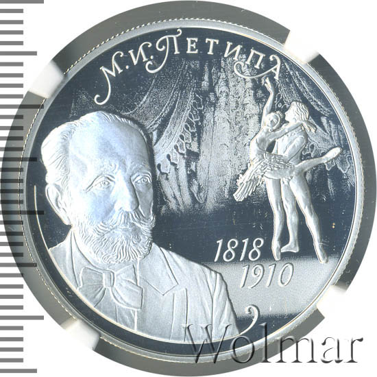Динамика цен по монете 2 рубля 2018 СПМД „200-летие со дня рождения балетмейстер М.И. Петипа“ PROOFБалетмейстер М.И. Петипа, к 200-летию со дня рождения (11.03.1818)Серия: Выдающиеся личности России Мариус Иванович Петипа (11.03.1818 — 01.07.1910) — французский и российский солист балета, балетмейстер, театральный деятель и педагог. Родился в семье балетмейстера и хореографа Жана-Антуана Петипа и драматической актрисы Викторины Марсо. Детство провел в Брюсселе, где помимо получения общего образования обучался игре на скрипке и посещал хореографическую школу своего отца. В начале 1830-х годов семья перебралась во Францию, где Мариус Петипа начал заниматься со знаменитым хореографом Огюстом Вестрисом. Выступал в Бордо, вместе с отцом гастролировал в Нью-Йорке, в 1843—1846 годах работал в Испании. В 1847 году Мариус Иванович Петипа переехал в Россию по приглашению директора императорских театров. На его первом выступлении в Петербурге присутствовал сам Николай I, который был в восторге от таланта молодого танцовщика. В 1862 году Мариус Петипа был официально назначен балетмейстером Петербургских императорских театров, а с 1869 года стал главным балетмейстером. Это место он занимал до 1903 года. Среди его балетов: «Царь Кандавл» (1868), «Дон Кихот» (1869), «Баядерка» (1877) и другие. «Баядерка» стала первым шедевром Петипа, особенно «акт теней», который до сих пор является образцом академического классического балета. Свои балеты Петипа предпочитал ставить в тесной связи с композиторами, если это было возможно. Совместная работа помогала балетмейстеру глубже проникнуть в суть музыки, а композитору — создать партитуру, гармонично сочетающуюся с хореографической частью. Вершин академизма и симфонизации танца Петипа достиг в балетах Петра Чайковского («Спящая красавица», 1890; «Лебединое озеро», 1895) и Александра Глазунова («Раймонда», 1898). Источники: www.balletland.com, www.ria.ru Аверсна зеркальном поле диска — рельефное изображение Государственного герба Российской Федерации, над ним вдоль канта — надпись полукругом: «РОССИЙСКАЯ ФЕДЕРАЦИЯ», обрамленная с обеих сторон сдвоенными ромбами, внизу под гербом: слева — обозначения драгоценного металла и пробы сплава, справа — содержание химически чистого металла и товарный знак монетного двора, внизу в центре в три строки — надпись: «БАНК РОССИИ», номинал монеты: «2 РУБЛЯ», год выпуска: «2018 г.».Реверсна переднем плане слева — рельефный портрет М.И. Петипа, на втором плане справа — дуэт из балета «Лебединое озеро» на фоне занавеса Мариинского театра, вверху вдоль канта — надпись: «М.И. ПЕТИПА», внизу в две строки — годы «1818» и «1910».Каталожные номера