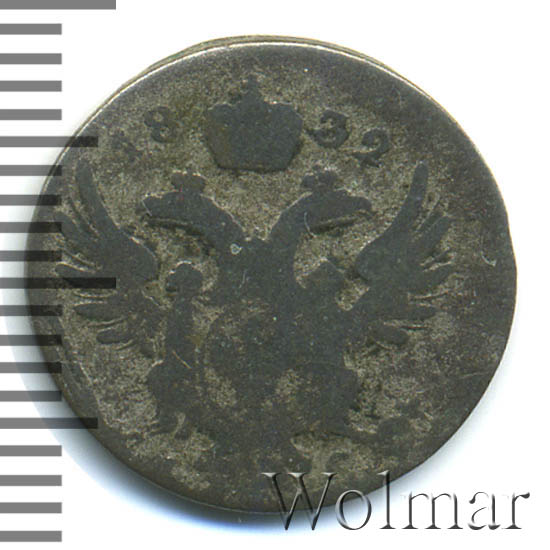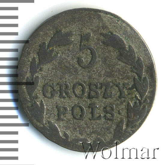 5 грошей 1832 года KGДата выпуска: 01.01.1832 АверсВ центре двуглавый орёл, головы которого увенчаны двумя коронами, третья, большая корона над ними. На груди орла герб Польского королевства под королевской короной и пологом. В правой лапе орла — скипетр и меч, в левой — держава. Под правой лапой — литера «K•", под левой — литера «G•". Инициалы минцмейстера Karol Gronau (Кароль Гронау). Над головами орла — дата выпуска «1832», разделённая большой короной.РеверсВ центре надпись в три строки: «5"│"GROSZY"│"POLS•". Вдоль канта изображен венок из двух лавровых ветвей, которые в нижней части переплетены лентой.Каталожные номера