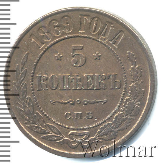 5 копеек 1869 года СПБДата выпуска: 01.01.1869 АверсВ центре монеты изображен Малый Государственный Герб Российской империи — двуглавый орел, головы которого увенчаны двумя коронами, третья, большая корона над ними. Все они соединены лентой Андрея Первозванного. В правой лапе орла — скипетр, в левой — держава. На его груди расположен Московский герб, в щите изображен Георгий Победоносец с копьем поражающий дракона. Вокруг щита цепь ордена Св. Апостола Андрея Первозванного. На крыльях орла изображены гербы: Царства Казанского, Польского, Херсонеса Таврического, Астраханского, Сибирского, Грузинского и герб соединенных княжеств Киевского, Новгородского и Владимирского — по 4 на каждое крыло. По окружности — две полукруглые плашки, соединенные узорами. На верхней плашке выпуклая надпись: «МЕДНАЯ РОССИЙСКАЯ МОНЕТА». На нижней плашке, изображенной в виде ленты, углубленная надпись: «ПЯТЬ КОПЕЕК».РеверсВ центре указан номинал «5», ограниченный с обеих сторон звездочками. Под цифрой номинала слово — «КОПЕЕК». Ниже, расположен декоративный разделитель в виде двух изогнутых линий и небольшой окружности между ними. Под линиями обозначение монетного двора «С.П.Б.». Центральная часть отделена от остального изображения, окружностью в виде точек. В верхней части по кругу углубленная надпись: «1869 ГОДА». Вдоль канта изображен венок из лавровой и дубовой ветви, которые в нижней части перевязаны лентой на узел бантом.Каталожные номера