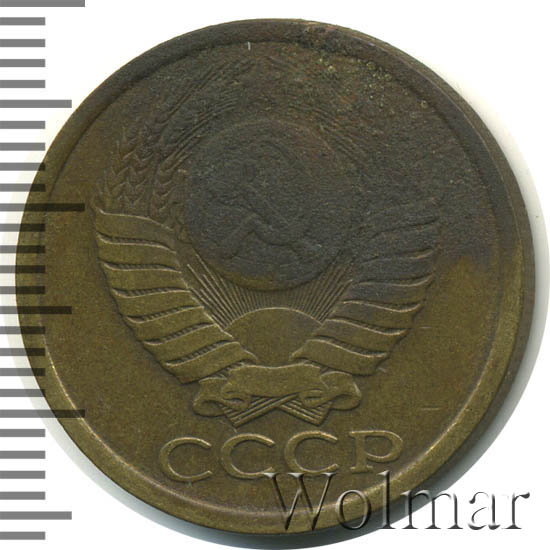 Разменные монеты номиналом 5 копеек 1961 - 1991Пятикопеечная монета времен позднего периода существования СССР изготовлена в виде кружка из медно-цинкового сплава. По периметру она имеет гладкую, выступающую с двух сторон окантовку. Все изображения и тексты возвышаются над основной плоскостью дензнака. Аверс. Как и у прочих монет низшего номинала, лицевая сторона пятикопеечной монеты украшена гербом Советского Союза и текстом под ним в виде аббревиатуры СССР. Реверс. Вдоль внешнего канта расположен венок, собранный из ветвей дуба и колосков пшеницы. Внутри него помещен номинал в виде цифры и букв (5 копеек), а также дата чеканки под ним. Гурт у монетки рубчатый. Диаметр круга составляет 25 мм. Номинальный вес — 5 грамм. Общий тираж выпуска превысил 1 миллиард экземпляров. Для чеканки использовалось несколько разновидностей штампов — только аверс встречается в четырех вариантах. |