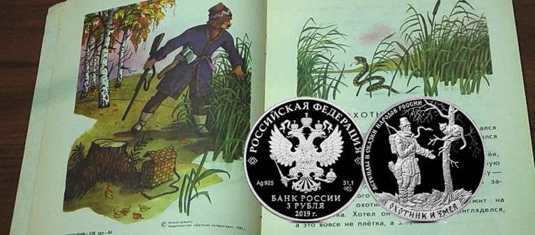5 сентября 2019 года Банк России выпустил в обращение памятные серебряные 3 рубля «Охотник и змея» из серии «Легенды и сказки народов…