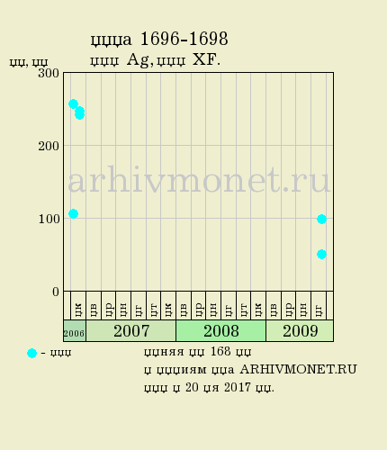 Средняя цена: 168 рублей (по 6 лотам). Торги по представленной на фото монете состоялись на аукционе Конрос 14 августа 2009 года. Достигнутая цена на торгах: 51 рублей.