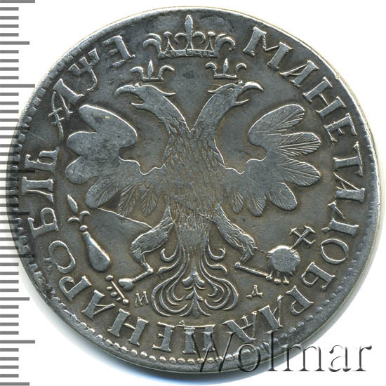 Динамика цен по монете 1 рубль 1705 МД («Е» в дате перевернута) „Портрет Петра I. Большая голова“ XF1 рубль 1705 года МД. «Е» в дате перевернутаДата выпуска: 01.01.1705 АверсВ центре профильный портрет вправо императора Петра I, увенчанный лавровым венком. Вокруг портрета круговая надпись: «ЦРЬ ПЕТРЪ АЛЕξIЕВИЧЪ ВСЕѦ РОСIИ ПОВЕЛИТЕЛЬ». По окружности канта — точечный ободок.РеверсВ центре изображен Государственный Герб России — двуглавый орёл с распущенными крыльями. Головы которого увенчаны двумя коронами, третья, большая корона над ними. В правой лапе орла — скипетр, в левой — держава. Под правой лапой — буква «М», под левой — буква «Д». Обозначение Кадашевского монетного двора. Вокруг орла надпись: «МАНЕТА ДОБРАѦ ЦЕНА РУБЛЬ ҂АѰЕ (1705)».Каталожные номера