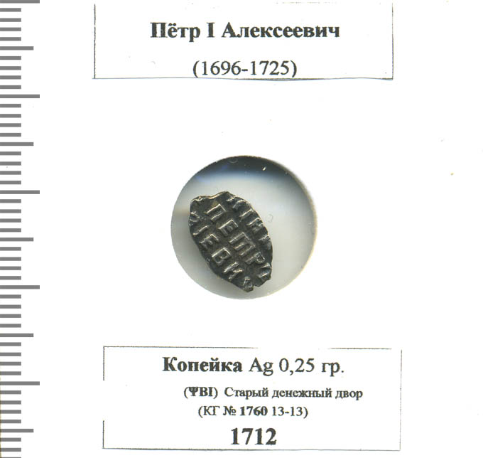 Петром I была проведена денежная реформа, в результате которой проволочные копейки ручного чекана были заменены круглыми монетами машинного чекана. На многих петровских монетах дата обозначена славянскими буквами. На главной странице сайта есть справочный листок по этим датам.