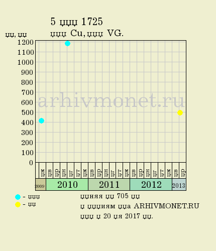 Средняя цена: 705 рублей (по 3 лотам). Торги по представленной на фото монете состоялись на аукционе Хабе 10 апреля 2013 года. Достигнутая цена на торгах: 497 рублей.
