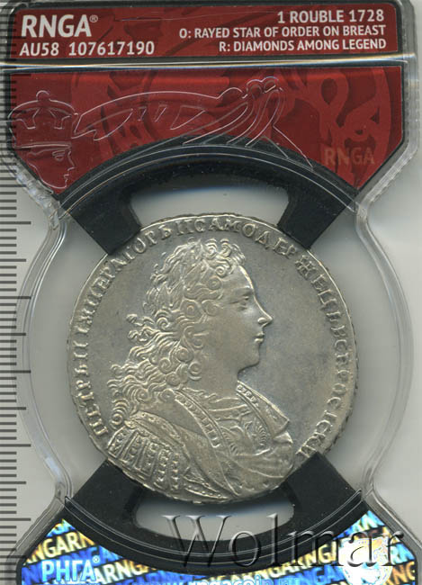 1 рубль 1728 года. Тип 1728 г. Ромбики в надписиДата выпуска: 01.01.1728 АверсВ центре профильный портрет вправо императора Петра II, увенчанный лавровым венком. Вокруг портрета надпись: «ПЕТРЪ II ИМПЕРАТОРЪ ИСАМОДЕРЖЕЦЪ ВСЕРОСIСКИ».РеверсВ центре изображена монограмма Петра II: четыре перекрещивающихся буквы «П», расположенных по кругу, верхней частью внутрь и увенчанных императорскими коронами. Между буквами — четыре римские цифры «II». В монограмме, посередине, цифры даты выпуска монеты: слева — «17», справа — «28» (1728 год), разделённые перекрестием букв монограммы. Вдоль канта круговая надпись: «МОНЕТА НОВАЯ ЦЕНА РУБЛЬ», разделённая на четыре части коронами.Каталожные номера