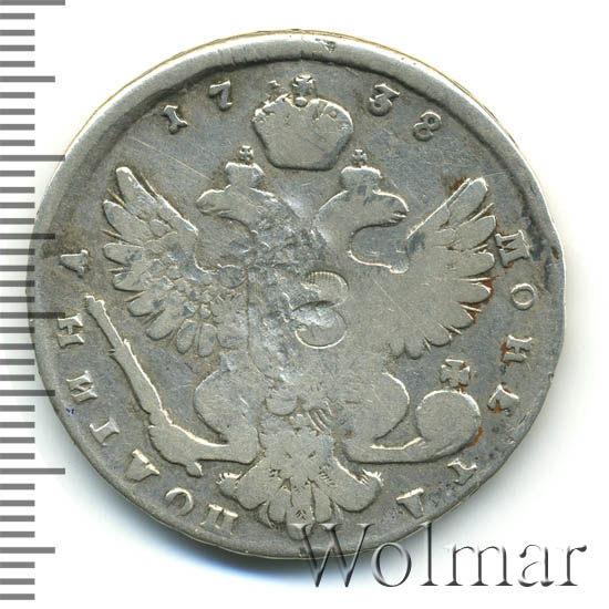 Динамика цен по монете Полтина 1738 - (Портрет работы Дмитриева) „Портрет Анны“ VFПолтина 1738 годаДата выпуска: 01.01.1738 АверсВ центре профильный портрет вправо императрицы Анны Иоанновны. Вокруг портрета круговая надпись: «Б•М•АННА• IМПЕРАТРИЦА•IСАМОДЕРЖИЦА ВСЕРОСИСКАЯ».РеверсВ центре изображен Государственный Герб Российской империи — двуглавый орёл с поднятыми вверх распущенными крыльями, головы которого увенчаны двумя коронами, третья, большая корона над ними. На груди орла расположен Московский герб — щит с изображением Георгия Победоносца, поражающего копьём дракона. Вокруг щита орденская цепь с орденом Св. апостола Андрея Первозванного. В правой лапе орла — скипетр, в левой — держава. Над орлом дата выпуска — «1738», разделённая большой короной. Вокруг орла, обращённая внутрь, надпись: «МОНЕТА ПОЛТИНА».Каталожные номера