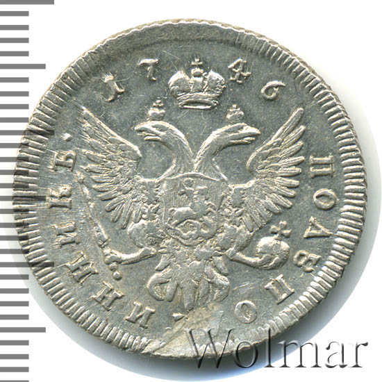 Полуполтинник 1746 года ММДДата выпуска: 01.01.1746 АверсВ центре профильный портрет вправо императрицы Елизаветы I (Петровны). Вокруг портрета круговая надпись: «Б•М•ЕЛИСАВЕТЪ•I•IМП: IСАМОД: ВСЕРОС:». Под портретом буквы «М•М•Д» — обозначение московского Красного монетного двора.РеверсВ центре изображен Государственный Герб Российской империи — двуглавый орёл, головы которого увенчаны двумя коронами, третья, большая корона над ними. На груди орла расположен Московский герб — щит с изображением Георгия Победоносца, поражающего копьём дракона. Вокруг щита орденская цепь с орденом Св. апостола Андрея Первозванного. В правой лапе орла скипетр, в левой — держава. Над орлом дата выпуска монеты — «1746». Вокруг орла, обращенная внутрь, надпись: «ПОЛУПОЛТИННИКЪ•".Каталожные номера