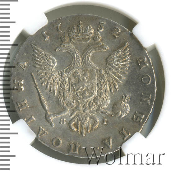 Полтина 1752 года СПБ-ЯIДата выпуска: 01.01.1752 АверсВ центре профильный портрет вправо императрицы Елизаветы I (Петровны). Вокруг портрета круговая надпись: «Б•М•ЕЛИСАВЕТЪ•I•IМП: IСАМОД: ВСЕРОС». Под портретом буквы «С П Б» — обозначение Санкт-Петербургского монетного двора.РеверсВ центре изображен Государственный Герб Российской империи — двуглавый орёл, головы которого увенчаны двумя коронами, третья, большая корона над ними. На груди орла расположен Московский герб — щит с изображением Георгия Победоносца, поражающего копьём дракона. Вокруг щита орденская цепь с орденом Св. апостола Андрея Первозванного. В правой лапе орла скипетр, в левой — держава. Под правой лапой — буква «Я», под левой — буква «I». Инициалы минцмейстера Якова Иванова. Над орлом дата выпуска монеты — «1752». Вокруг орла, обращенная внутрь, надпись: «МОНЕТА•ПОЛТИНА•".Каталожные номера