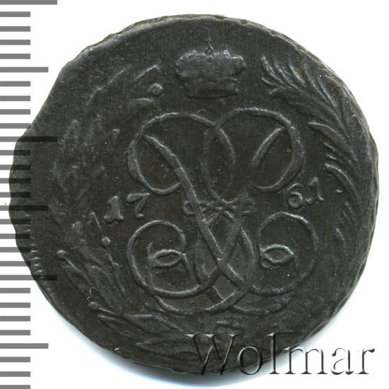 1 копейка 1761 годаДата выпуска: 01.01.1761 АверсВ центре — рельефное изображение Георгия Победоносца верхом на коне, поражающего копьём дракона. Внизу, под центральным изображением, полукругом располагается бандероль с обозначением номинала — «КОПЕИКА».РеверсВ центре изображён вензель императрицы Елизаветы I (Петровны). Над вензелем — императорская корона. По обеим сторонам от вензеля цифры даты выпуска монеты: слева — «17», справа — «61» (1761 год). Вокруг центрального изображения, вдоль канта, изображён венок из лавровой и пальмовой ветвей, которые, в нижней части, перевязаны лентой на узел бантом.Каталожные номера
