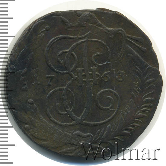 5 копеек 1763 года СПМ. Буквы «СПМ» меньше. Корона меньше. Бант большеДата выпуска: 01.01.1763 АверсВ центре изображен Государственный Герб Российской империи — двуглавый орёл с поднятыми вверх распущенными крыльями. Головы которого увенчаны двумя коронами, третья, большая корона над ними. На груди орла расположен Московский герб — щит с изображением Георгия Победоносца, поражающего копьём дракона. Вокруг щита орденская цепь с орденом Св. Апостола Андрея Первозванного. В правой лапе орла — скипетр, в левой — держава. Под правой лапой — буква «С•П», под левой — буква «М». Обозначение Санкт-Петербургского монетного двора. Внизу, под центральным изображением, полукругом располагается бандероль с обозначением номинала — «ПЯТЬ•КОПѢЕКЪ».РеверсВ центре изображён вензель Екатерины II. Над вензелем — императорская корона. По обеим сторонам от вензеля цифры даты выпуска монеты: слева — «17», справа — «63» (1763 год). Вокруг центрального изображения, вдоль канта, изображён венок из лавровой и пальмовой ветвей, которые, в нижней части, перевязаны лентой на узел бантом.Каталожные номера