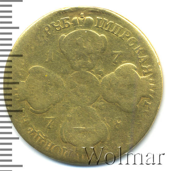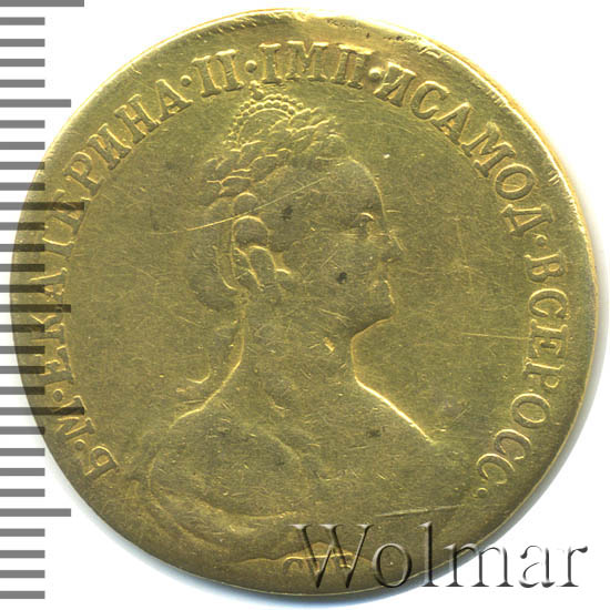 10 рублей 1778 года СПБДата выпуска: 01.01.1778 АверсВ центре профильный портрет вправо императрицы Екатерины II. Вокруг портрета круговая надпись: «Б•М•ЕКАТЕРИНА•II•IМП•IСАМОД•ВСЕРОСС•". Под портретом буквы «С П Б», обозначение Санкт-Петербургского монетного двора. По окружности канта имеются рельефные элементы, выполненные в виде зубцов.РеверсВ центре расположены, в виде креста, пять щитов с гербами. Центральный щит — изображение Герба Российской империи — двуглавый орёл со скипетром и державой. Верхний щит — Московский герб, нижний — герб царства Сибирского. Щит слева — герб царства Астраханского, справа — царства Казанского. Верхний щит венчает императорская корона, три других щита венчают царские короны. Между круговыми гербами — четыре маленькие розы, над ними цифры даты выпуска: «1», «7», «7», «8». По кругу, вдоль канта, надпись: «IМПРСКАЯ» «РОССÏЙС» «МОН•ЦЕНА» «ДЕСЯТ•РУБ», разделённая на четыре части коронами. По окружности канта имеются рельефные элементы, выполненные в виде зубцов.Каталожные номера
