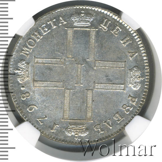 Динамика цен по монете 1 рубль 1798 СМ МБ MS1 рубль 1798 года СМ-МБДата выпуска: 01.01.1798 АверсВ центре изображена крестообразная монограмма, состоящая из 4 букв «П», увенчанных императорскими коронами и римской цифры «I» в центре. Вдоль канта круговая надпись: «МОНЕТА ЦЕНА РУБЛЬ 1798.», разделённая на 4 части императорскими коронами.РеверсВ центре изображен картуш с надписью в четыре строки: «НЕ НАМЪ"│"НЕ НАМЪ"│"А ИМЯНИ"│"ТВОЕМУ.». Под надписью буквы: слева — «С.М.», обозначение Санкт-Петербургского монетного двора, справа — «М.Б», инициалы минцмейстера Михаила Бобровщикова.Каталожные номера