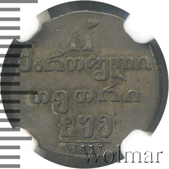 Полуабаз 1805 года ПЗДата выпуска: 01.01.1805 АверсВ центре надпись «თბილისი" (Тбилиси). Над надписью — каменная зубчатая корона (эмблема Тбилиси). Под надписью — перекрещённые пальмовая и оливковая ветви.РеверсВ центре надпись — надпись в две строки: «ქართლი თეთრი" (грузинское серебро). Над надписью грузинская цифра, обозначающая номинал — 100 динаров (10 копеек). Ниже надписи указан год чеканки. Под ним фигурная черта. Под чертой буквы «П.З». Инициалы минцмейстера Петра Зайцева.Каталожные номера