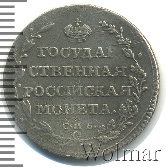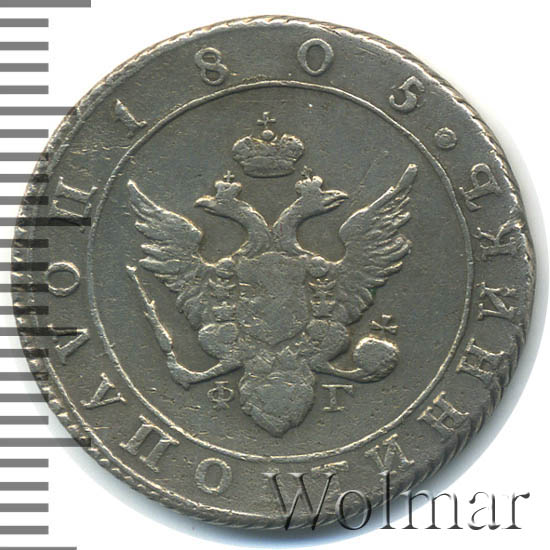 Полуполтинник 1805 года СПБ-ФГДата выпуска: 01.01.1805 АверсВ центральной части изображен Государственный Герб Российской империи — двуглавый орёл, головы которого увенчаны двумя коронами, третья, большая корона над ними. На груди орла расположен Московский герб — щит с изображением Георгия Победоносца, поражающего копьем дракона. Вокруг щита орденская цепь с орденом Св. Апостола Андрея Первозванного. В правой лапе орла — скипетр, в левой — держава. Под правой лапой — буква «Ф», под левой — буква «Г». Инициалы минцмейстера Федора Гельмана. Центральная часть заключена в круговой ободок. За ободком, вдоль канта, круговые надписи: над орлом — «1805», дата выпуска монеты. Справа от даты — небольшая окружность в центре которой, выпуклая точка. Вокруг гербового орла круговая надпись — «ПОЛУПОЛТИННИКЪ». По окружности канта имеются рельефные элементы, выполненные в виде зубцов.РеверсВ центре надпись в четыре строки: «ГОСУДАР="│"СТВЕННАЯ"│"РОССIЙСКАЯ"│"МОНЕТА.». Над надписью — императорская корона. Под надписью — обозначение Санкт-Петербургского монетного двора «С.П Б.». Вдоль канта, не доходя до короны, изображен венок из лавровой и дубовой ветви, которые в нижней части перевязаны лентой на узел бантом. По окружности канта имеются рельефные элементы, выполненные в виде зубцов.Каталожные номера