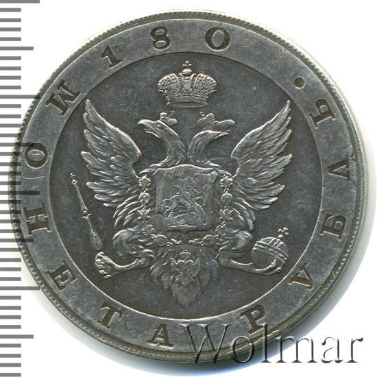 1 рубль 1806 годаДата выпуска: 01.01.1806 АверсВ центре профильный бюст вправо императора Александра I в мундире Лейб-гвардии Преображенского полка. Под портретом подпись медальера «LEBERECHT F.» — Carl (Карл Александрович Леберехт) Leberecht F.(Fecit — резал). Вокруг портрета надпись: «Б. М. АЛЕКСАНДРЪ I. ИМПЕРАТОРЪ И САМОДЕР. ВСЕРОС.». По окружности канта имеются рельефные элементы, выполненные в виде зубцов.РеверсВ центральной части изображен Государственный Герб Российской империи — двуглавый орёл, головы которого увенчаны двумя коронами, третья, большая корона над ними. На груди орла расположен Московский герб — щит с изображением Георгия Победоносца, поражающего копьем дракона. Вокруг щита орденская цепь с орденом Св. Апостола Андрея Первозванного. В правой лапе орла — скипетр, в левой — держава. Вокруг орла, вдоль канта, круговая, обращённая наружу, надпись: «МОНЕТА РУБЛЬ 1806•". По окружности канта имеются рельефные элементы, выполненные в виде зубцов.Каталожные номера