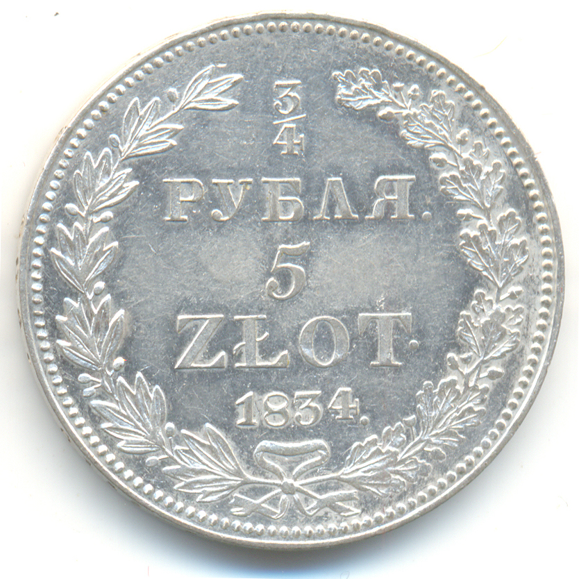 Динамика цен по монете ¾ рубля/5 злотых 1834 НГ „Русско-Польские монеты“ AU¾ рубля — 5 злотых 1834 года НГ «Русско-польские» (русско-польские)Дата выпуска: 01.01.1834 АверсВ центре изображен Государственный Герб Российской империи — двуглавый орёл, головы которого увенчаны двумя коронами, третья, большая корона над ними. На груди орла расположен Московский герб — щит с изображением Георгия Победоносца, поражающего копьем дракона. Вокруг щита орденская цепь с орденом Св. Апостола Андрея Первозванного. На крыльях изображены титульные гербы: на правом — Казанский, Астраханский и Сибирский, на левом — Польский, Таврический и Финляндский. В правой лапе орла — скипетр, в левой — держава. Под правой лапой — буква «Н», под левой — буква «Г». Инициалы минцмейстера Николая Грачева. Центральная часть отделена от остального изображения, окружностью в виде точек. За окружностью круговая надпись: «ЧИСТАГО СЕРЕБРА 3 ЗОЛОТНИКА 15 ¾ ДОЛЕЙ», разделенная сверху цветочной розеткой. По окружности канта имеются рельефные элементы, выполненные в виде точек.РеверсВ центре надпись в четыре строки: «¾"│"РУБЛЯ."│"5"│"ZLOT•". Под надписью дата выпуска монеты — «1834.». Вдоль канта изображен венок из лавровой и дубовой ветви, которые в нижней части перевязаны лентой на узел бантом. По окружности канта имеются рельефные элементы, выполненные в виде точек.Каталожные номера