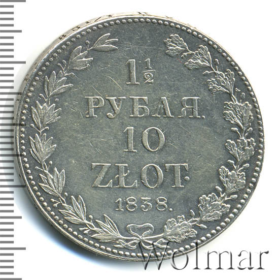 1 ½ рубля — 10 злотых 1838 года MW «Русско-польские» (русско-польские)Дата выпуска: 01.01.1838 АверсВ центре изображен Государственный Герб Российской империи — двуглавый орёл, головы которого увенчаны двумя коронами, третья, большая корона над ними. На груди орла расположен Московский герб — щит с изображением Георгия Победоносца, поражающего копьем дракона. Вокруг щита орденская цепь с орденом Св. Апостола Андрея Первозванного. На крыльях изображены титульные гербы: на правом — Казанский, Астраханский и Сибирский, на левом — Польский, Таврический и Финляндский. В правой лапе орла — скипетр, в левой — держава. Под правой лапой — буква «M», под левой — буква «W». Обозначение Варшавского монетного двора. Центральная часть отделена от остального изображения, окружностью в виде точек. За окружностью круговая надпись: «ЧИСТАГО СЕРЕБРА 6 ЗОЛОТНИКОВЪ 31 ½ ДОЛЕЙ», разделенная сверху цветочной розеткой. По окружности канта имеются рельефные элементы, выполненные в виде точек.РеверсВ центре надпись в четыре строки: «1 ½"│"РУБЛЯ."│"10"│"ZLOT•". Под надписью дата выпуска монеты — «1838.». Вдоль канта изображен венок из лавровой и дубовой ветви, которые в нижней части перевязаны лентой на узел бантом. По окружности канта имеются рельефные элементы, выполненные в виде точек.Каталожные номера