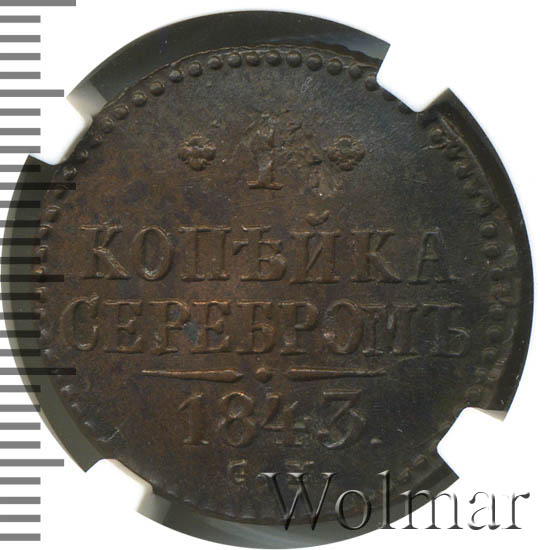 Динамика цен по монете 1 копейка серебром 1843 СМ MS1 копейка 1843 года СМДата выпуска: 01.01.1843 АверсВ центре вензель Николая I. Над ним Корона Российской империи. По окружности канта имеются рельефные элементы, выполненные в виде точек.РеверсВ центре надпись в две строки: «КОПѢЙКА"│"СЕРЕБРОМЪ». Над надписью обозначение номинала — цифра «1», ограниченная с обеих сторон цветочными розетками. Под надписью расположен декоративный разделитель в виде двух фигурных линий и небольшой точки между ними. Под разделителем — год выпуска монеты «1843.». Ниже, обозначение монетного двора — буквы «С.М.». По окружности канта имеются рельефные элементы, выполненные в виде точек.Каталожные номера