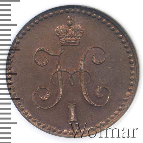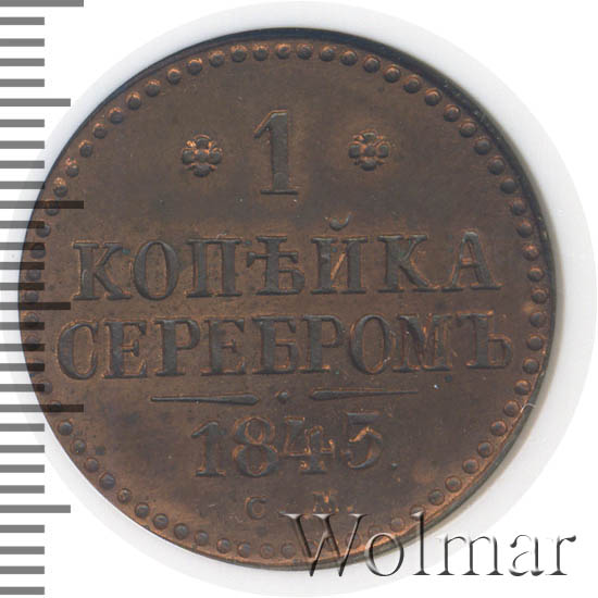 1 копейка 1843 года СМДата выпуска: 01.01.1845 АверсВ центре вензель Николая I. Над ним Корона Российской империи. По окружности канта имеются рельефные элементы, выполненные в виде точек.РеверсВ центре надпись в две строки: «КОПѢЙКА"│"СЕРЕБРОМЪ». Над надписью обозначение номинала — цифра «1», ограниченная с обеих сторон цветочными розетками. Под надписью расположен декоративный разделитель в виде двух фигурных линий и небольшой точки между ними. Под разделителем — год выпуска монеты «1845.». Ниже, обозначение монетного двора — буквы «С.М.». По окружности канта имеются рельефные элементы, выполненные в виде точек.Каталожные номера