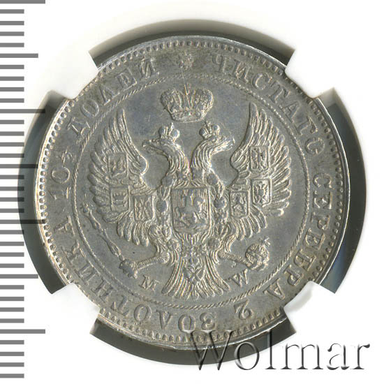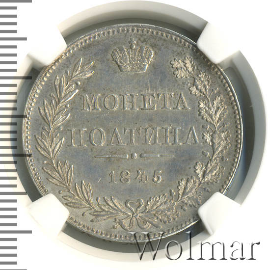 Полтина 1845 года MWДата выпуска: 01.01.1845 АверсВ центре изображен Государственный Герб Российской империи — двуглавый орёл, головы которого увенчаны двумя коронами, третья, большая корона над ними. На груди орла расположен Московский герб — щит с изображением Георгия Победоносца, поражающего копьем дракона. Вокруг щита орденская цепь с орденом Св. Апостола Андрея Первозванного. На крыльях изображены титульные гербы: на правом — Казанский, Астраханский и Сибирский, на левом — Польский, Таврический и Финляндский. В правой лапе орла — скипетр, в левой — держава. Под правой лапой — буква «M», под левой — буква «W». Обозначение Варшавского монетного двора. Центральная часть отделена от остального изображения, окружностью в виде точек. За окружностью круговая надпись: «ЧИСТОГО СЕРЕБРА 2 ЗОЛОТНИКА 10 ½ ДОЛЕЙ», разделенная сверху цветочной розеткой. По окружности канта имеются рельефные элементы, выполненные в виде зубцов.РеверсВ центре указан номинал «МОНЕТА ПОЛТИНА» в две строки. Над номиналом — Корона Российской империи. Под номиналом расположен декоративный разделитель в виде двух разнонаправленных фигурных линий и небольшой окружности между ними, в центре которой, выпуклая точка. Под разделителем — дата выпуска монеты «1845». Вдоль канта, не доходя до короны, изображен венок из лавровой и дубовой ветви, которые в нижней части перевязаны лентой на узел бантом. По окружности канта имеются рельефные элементы, выполненные в виде зубцов.Каталожные номера