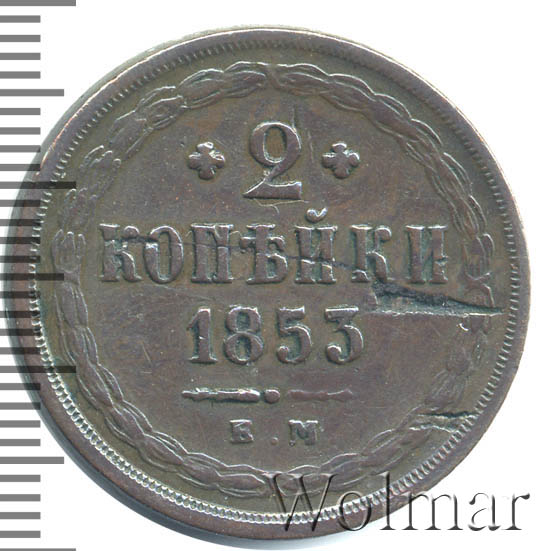 2 копейки 1853 года ВМДата выпуска: 01.01.1853 АверсВ центре изображен Государственный Герб Российской империи — двуглавый орёл, головы которого увенчаны двумя коронами, третья, большая корона над ними. На груди орла расположен Московский герб — щит с изображением Георгия Победоносца, поражающего копьем дракона. Вокруг щита орденская цепь с орденом Св. Апостола Андрея Первозванного. На крыльях изображены титульные гербы: на правом — Казанский, Астраханский и Сибирский, на левом — Польский, Таврический и Финляндский. В правой лапе орла — скипетр, в левой — держава. По окружности канта имеются рельефные элементы, выполненные в виде зубцов.РеверсВ центре указан номинал «2», ограниченный с обеих сторон цветочными розетками. Под цифрой номинала — слово «КОПЕЙКИ», под ним год выпуска монеты «1853.». Ниже, расположен декоративный разделитель в виде двух фигурных линий и небольшой точки между ними. Под разделителем обозначение монетного двора «В.М.».По окружности, вдоль канта, декоративный венок вверху, внизу, справа и слева крестообразно перехваченный лентами. По окружности канта имеются рельефные элементы, выполненные в виде зубцов.Каталожные номера