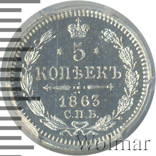 5 копеек 1863 года СПБ-АБДата выпуска: 01.01.1863 АверсВ центре изображен Малый Государственный Герб Российской империи — двуглавый орёл, головы которого увенчаны двумя коронами, третья, большая корона над ними. Все они соединены орденской лентой ордена Св. Апостола Андрея Первозванного. На груди орла расположен Московский герб, в щите изображен Георгий Победоносец с копьем поражающий дракона. Вокруг щита цепь ордена Св. Апостола Андрея Первозванного. На крыльях изображены гербы: Царства Казанского, Польского, Херсонеса Таврического, Астраханского, Сибирского, Грузинского и герб соединенных княжеств Киевского, Новгородского и Владимирского — по 4 на каждое крыло. В правой лапе орла — скипетр, в левой — держава. Под правой лапой — буква «А», под левой — буква «Б». Инициалы минцмейстера Александра Белозерова. По окружности канта имеются рельефные элементы, выполненные в виде зубцов.РеверсВ центре указан номинал «5», ограниченный с обеих сторон шестиконечными звездочками. Над цифрой — Корона Российской империи. Под цифрой номинала — слово «КОПЕЕК». Ниже, расположен декоративный разделитель в виде двух разнонаправленных фигурных линий и стилизованным из точек крестом между ними. Под разделителем — дата выпуска монеты «1863». Под цифрой даты — обозначение монетного двора «С.П.Б.». Вдоль канта, не доходя до короны, изображен венок из лавровой и дубовой ветви, которые в нижней части перевязаны лентой на узел бантом. По окружности канта имеются рельефные элементы, выполненные в виде зубцов.Каталожные номера