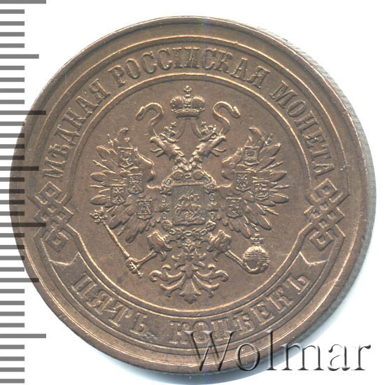 5 копеек 1869 года СПБДата выпуска: 01.01.1869 АверсВ центре монеты изображен Малый Государственный Герб Российской империи — двуглавый орел, головы которого увенчаны двумя коронами, третья, большая корона над ними. Все они соединены лентой Андрея Первозванного. В правой лапе орла — скипетр, в левой — держава. На его груди расположен Московский герб, в щите изображен Георгий Победоносец с копьем поражающий дракона. Вокруг щита цепь ордена Св. Апостола Андрея Первозванного. На крыльях орла изображены гербы: Царства Казанского, Польского, Херсонеса Таврического, Астраханского, Сибирского, Грузинского и герб соединенных княжеств Киевского, Новгородского и Владимирского — по 4 на каждое крыло. По окружности — две полукруглые плашки, соединенные узорами. На верхней плашке выпуклая надпись: «МЕДНАЯ РОССИЙСКАЯ МОНЕТА». На нижней плашке, изображенной в виде ленты, углубленная надпись: «ПЯТЬ КОПЕЕК».РеверсВ центре указан номинал «5», ограниченный с обеих сторон звездочками. Под цифрой номинала слово — «КОПЕЕК». Ниже, расположен декоративный разделитель в виде двух изогнутых линий и небольшой окружности между ними. Под линиями обозначение монетного двора «С.П.Б.». Центральная часть отделена от остального изображения, окружностью в виде точек. В верхней части по кругу углубленная надпись: «1869 ГОДА». Вдоль канта изображен венок из лавровой и дубовой ветви, которые в нижней части перевязаны лентой на узел бантом.Каталожные номера