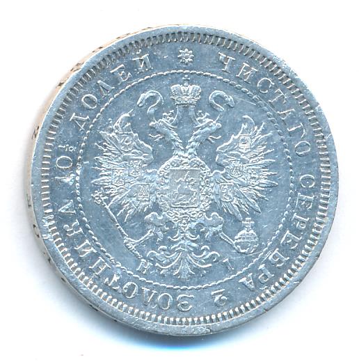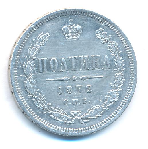 Полтина 1872 года СПБ-HIДата выпуска: 01.01.1872 АверсВ центре изображен Малый Государственный Герб Российской империи — двуглавый орёл, головы которого увенчаны двумя коронами, третья, большая корона над ними. Все они соединены орденской лентой ордена Св. Апостола Андрея Первозванного. На груди орла расположен Московский герб, в щите изображен Георгий Победоносец с копьем поражающий дракона. Вокруг щита цепь ордена Св. Апостола Андрея Первозванного. На крыльях изображены гербы: Царства Казанского, Польского, Херсонеса Таврического, Астраханского, Сибирского, Грузинского и герб соединенных княжеств Киевского, Новгородского и Владимирского — по 4 на каждое крыло. В правой лапе орла — скипетр, в левой — держава. Под правой лапой — буква «Н», под левой — буква «I». Инициалы минцмейстера Николая Иоссы. Центральная часть отделена от остального изображения, окружностью в виде точек. За окружностью круговая надпись: «ЧИСТОГО СЕРЕБРА 2 ЗОЛОТНИКА 10 ½ ДОЛЕЙ», разделенная сверху цветочной розеткой. По окружности канта имеются рельефные элементы, выполненные в виде зубцов.РеверсВ центре указан номинал «ПОЛТИНА». Над номиналом — Корона Российской империи. Под номиналом расположен декоративный разделитель в виде двух разнонаправленных фигурных линий и небольшой выпуклой точки между ними. Под разделителем — дата выпуска монеты «1872». Под цифрой даты — обозначение монетного двора «С.П.Б.». Вдоль канта, не доходя до короны, изображен венок из лавровой и дубовой ветви, которые в нижней части перевязаны лентой на узел бантом. По окружности канта имеются рельефные элементы, выполненные в виде зубцов.Каталожные номера