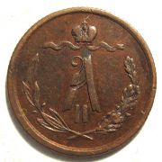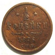 ½ копейки 1876 года ЕМДата выпуска: 01.01.1876 АверсВ центре вензель Александра II. Над ним Корона Российской империи с двумя развевающимися концами ленты Ордена Святого апостола Андрея Первозванного. Под вензелем, вдоль канта, две скрещенные ветви: слева лавровая, справа дубовая.РеверсВ центре указан номинал «½», ограниченный с обеих сторон звездочками. Под цифрой номинала слово — «КОПЕЙКИ». Ниже, расположен декоративный разделитель в виде двух изогнутых линий и небольшой окружности между ними. Под линиями год выпуска монеты «1876» и под ним обозначение монетного двора «Е.М.».Каталожные номера