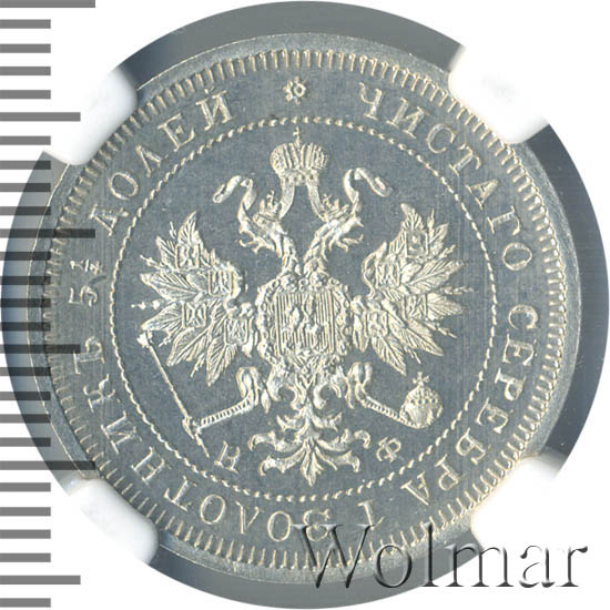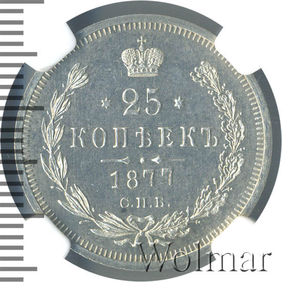 25 копеек 1877 года СПБ-НФДата выпуска: 01.01.1877 АверсВ центре изображен Малый Государственный Герб Российской империи — двуглавый орёл, головы которого увенчаны двумя коронами, третья, большая корона над ними. Все они соединены орденской лентой ордена Св. Апостола Андрея Первозванного. На груди орла расположен Московский герб, в щите изображен Георгий Победоносец с копьем поражающий дракона. Вокруг щита цепь ордена Св. Апостола Андрея Первозванного. На крыльях изображены гербы: Царства Казанского, Польского, Херсонеса Таврического, Астраханского, Сибирского, Грузинского и герб соединенных княжеств Киевского, Новгородского и Владимирского — по 4 на каждое крыло. В правой лапе орла — скипетр, в левой — держава. Под правой лапой — буква «Н», под левой — буква «Ф». Инициалы минцмейстера Николая Фоллендорфа. Центральная часть отделена от остального изображения, окружностью в виде точек. За окружностью круговая надпись: «ЧИСТОГО СЕРЕБРА 1 ЗОЛОТНИК 5 ¼ ДОЛЕЙ», разделенная сверху цветочной розеткой. По окружности канта имеются рельефные элементы, выполненные в виде зубцов.РеверсВ центре указан номинал «25», ограниченный с обеих сторон шестиконечными звездочками. Над цифрой — Корона Российской империи. Под цифрой номинала — слово «КОПЕЕК». Ниже, расположен декоративный разделитель в виде двух разнонаправленных фигурных линий и небольшой выпуклой точки между ними. Под разделителем — дата выпуска монеты «1877». Под цифрой даты — обозначение монетного двора «С.П.Б.». Вдоль канта, не доходя до короны, изображен венок из лавровой и дубовой ветви, которые в нижней части перевязаны лентой на узел бантом. По окружности канта имеются рельефные элементы, выполненные в виде зубцов.Каталожные номера