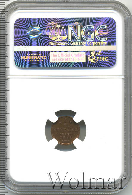 ¼ копейки 1878 года СПБДата выпуска: 01.01.1878 АверсВ центре вензель Александра II. Над ним Корона Российской империи с двумя развевающимися концами ленты Ордена Святого апостола Андрея Первозванного. Под вензелем, вдоль канта, две скрещенные ветви: слева лавровая, справа дубовая.РеверсВ центре указан номинал «¼», ограниченный с обеих сторон звездочками. Под цифрой номинала слово — «КОПЕЙКИ». Ниже, расположен декоративный разделитель в виде двух изогнутых линий и небольшой окружности между ними. Под линиями год выпуска монеты «1878» и под ним обозначение монетного двора «С.П.Б.».Каталожные номера