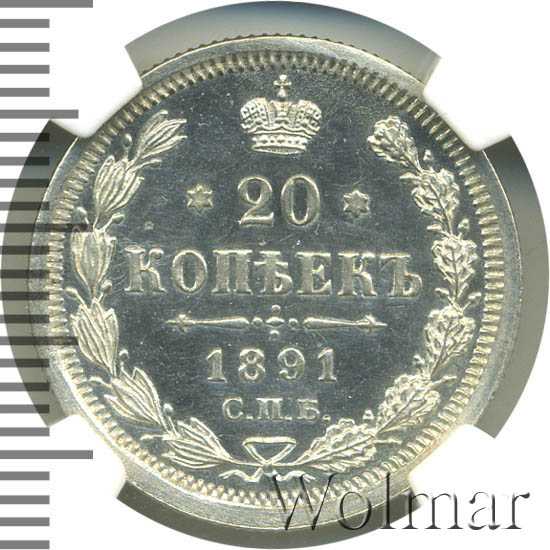 20 копеек 1891 года СПБ-АГДата выпуска: 01.01.1891 АверсВ центре изображен Малый Государственный Герб Российской империи — двуглавый орёл, головы которого увенчаны двумя коронами, третья, большая корона над ними. Все они соединены орденской лентой ордена Св. Апостола Андрея Первозванного. На груди орла расположен Московский герб, в щите изображен Георгий Победоносец с копьем поражающий дракона. Вокруг щита цепь ордена Св. Апостола Андрея Первозванного. На крыльях изображены гербы: Царства Казанского, Польского, Херсонеса Таврического, Астраханского, Сибирского, Грузинского и герб соединенных княжеств Киевского, Новгородского и Владимирского — по 4 на каждое крыло. В правой лапе орла — скипетр, в левой — держава. Под правой лапой — буква «А», под левой — буква «Г». Инициалы минцмейстера Аполлона Грасгофа. По окружности канта имеются рельефные элементы, выполненные в виде зубцов.РеверсВ центре указан номинал «20», ограниченный с обеих сторон шестиконечными звездочками. Над цифрой — Корона Российской империи. Под цифрой номинала — слово «КОПЕЕК». Ниже, расположен декоративный разделитель в виде двух разнонаправленных фигурных линий и стилизованным из точек крестом между ними. Под разделителем — дата выпуска монеты «1891». Под цифрой даты — обозначение монетного двора «С.П.Б.». Вдоль канта, не доходя до короны, изображен венок из лавровой и дубовой ветви, которые в нижней части перевязаны лентой на узел бантом. По окружности канта имеются рельефные элементы, выполненные в виде зубцов.Каталожные номера