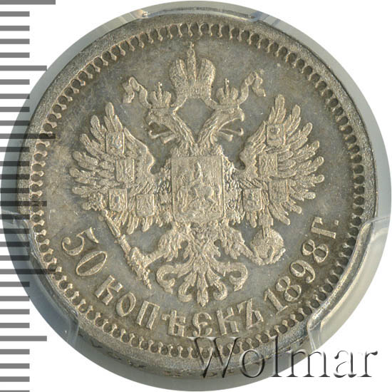 50 копеек 1898 года АГДата выпуска: 01.01.1898 АверсВ центре профильный портрет влево императора Николая II. Слева надпись «Б.М. НИКОЛАЙ II ИМПЕРАТОР», справа — «И САМОДЕРЖЕЦ ВСЕРОСС.». По окружности канта имеются рельефные элементы, выполненные в виде зубцов.РеверсВ центре изображен Малый Государственный Герб Российской империи — двуглавый орёл, головы которого увенчаны двумя коронами, третья, большая корона над ними. Все они соединены орденской лентой ордена Св. Апостола Андрея Первозванного. На груди орла расположен Московский герб, в щите изображен Георгий Победоносец с копьем поражающий дракона. Вокруг щита цепь ордена Св. Апостола Андрея Первозванного. На крыльях изображены гербы: Царства Казанского, Польского, Херсонеса Таврического, Астраханского, Сибирского, Грузинского и герб соединенных княжеств Киевского, Новгородского и Владимирского — по 4 на каждое крыло. В правой лапе орла — скипетр, в левой — держава. Под ним слева направо изображены: номинал — надпись «50 копеек» и дата выпуска «1898 Г.». По окружности канта имеются рельефные элементы, выполненные в виде зубцов.Каталожные номера