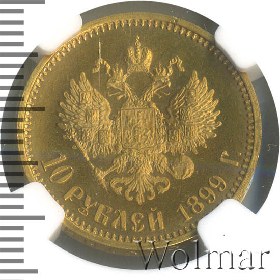 10 рублей 1899 года АГДата выпуска: 01.01.1899 АверсВ центре профильный портрет влево императора Николая II. Слева от портрета надпись «Б.М. НИКОЛАЙ II ИМПЕРАТОРЪ», справа — «И САМОДЕРЖЕЦЪ ВСЕРОСС.». По окружности канта имеются рельефные элементы, выполненные в виде зубцов.РеверсВ центре изображен Малый Государственный Герб Российской империи — двуглавый орёл, головы которого увенчаны двумя коронами, третья, большая корона над ними. Все они соединены орденской лентой ордена Св. апостола Андрея Первозванного. На груди орла расположен Московский герб — щит с изображением Георгия Победоносца с копьём поражающего дракона. Вокруг щита цепь ордена Св. апостола Андрея Первозванного. На крыльях изображены гербы: Царства Казанского, Польского, Херсонеса Таврического, Астраханского, Сибирского, Грузинского и герб соединенных княжеств Киевского, Новгородского и Владимирского — по 4 на каждое крыло. В правой лапе орла — скипетр, в левой — держава. Под ним слева направо изображены: номинал — надпись «10 РУБЛЕЙ» и дата выпуска «1899 Г.». По окружности канта имеются рельефные элементы, выполненные в виде зубцов.Каталожные номера
