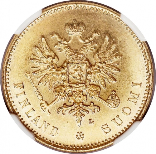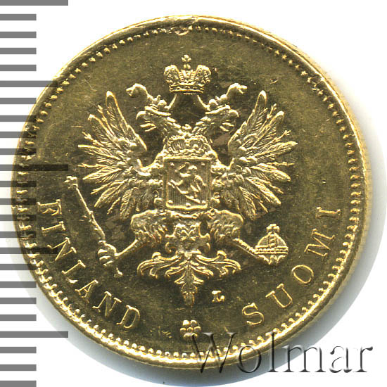 Динамика цен по монете 20 марок 1904 L „Для Финляндии“ MS20 марок 1904 года LДата выпуска: 01.01.1904 АверсВ центре изображён полный Герб Великого княжества Финляндского — двуглавый орёл, головы которого увенчаны двумя коронами, третья, большая корона над ними. Все они соединены орденской лентой ордена Св. Апостола Андрея Первозванного. На груди орла расположен щит с титульным гербом Великого князя Финляндского, увенчанный княжеской короной. Вокруг щита орденская цепь с орденом Св. Апостола Андрея Первозванного. В правой лапе орла — скипетр, в левой — держава. Под хвостом, справа, знак директора Гельсингфосского монетного двора — литера «L», Johan Conrad Lihr (Йохан Конрад Лир). Внизу, вдоль канта, полукругом надпись: «FINLAND SUOMI», разделённая стилизованной розеткой из семи точек. По окружности канта имеются рельефные элементы, выполненные в виде зубцов.РеверсВ центре слово «MARKKAA». Над словом указан номинал — цифра «20». Под словом расположен декоративный разделитель в виде двух разнонаправленных фигурных линий и точки между ними. Под разделителем — дата выпуска монеты «1904». Вокруг центрального изображения — витой ободок. За ободком круговая надпись: «5,806.GRM. KULTAA. 0,645.GRM. KUPARIA.», сверху разделённая стилизованной розеткой из семи точек. По окружности канта имеются рельефные элементы, выполненные в виде зубцов.Каталожные номера