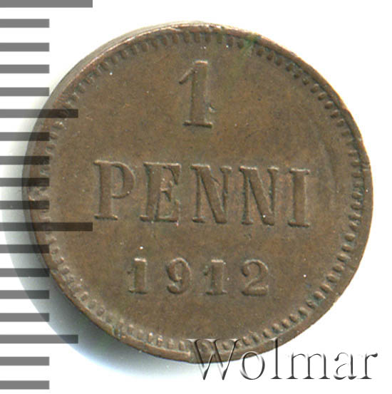 Динамика цен по монете 1 пенни 1912 - „Для Финляндии. Вензель Николая II“ MS1 пенни 1912 годаДата выпуска: 01.01.1912 АверсВ центре вензель Николая II. Над ним императорская корона с лентами ордена Св. Апостола Андрея Первозванного. По окружности канта имеются рельефные элементы, выполненные в виде зубцов.РеверсВ центре надпись в три строки: «1"│"PENNI"│"1912». По окружности канта имеются рельефные элементы, выполненные в виде зубцов.Каталожные номера