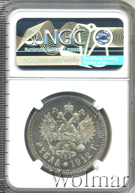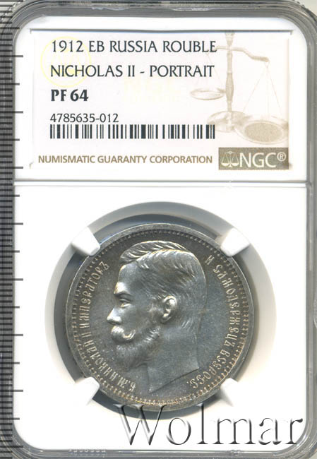Динамика цен по монете 1 рубль 1912 ЭБ „Портрет Николая II“ PROOF1 рубль 1912 года ЭБДата выпуска: 01.01.1912 АверсВ центре профильный портрет влево императора Николая II. Слева надпись «Б.М. НИКОЛАЙ II ИМПЕРАТОР», справа — «И САМОДЕРЖЕЦ ВСЕРОСС.». По окружности канта имеются рельефные элементы, выполненные в виде зубцов.РеверсВ центре изображен Малый Государственный Герб Российской империи — двуглавый орёл, головы которого увенчаны двумя коронами, третья, большая корона над ними. Все они соединены орденской лентой ордена Св. Апостола Андрея Первозванного. На груди орла расположен Московский герб, в щите изображен Георгий Победоносец с копьем поражающий дракона. Вокруг щита цепь ордена Св. Апостола Андрея Первозванного. На крыльях изображены гербы: Царства Казанского, Польского, Херсонеса Таврического, Астраханского, Сибирского, Грузинского и герб соединенных княжеств Киевского, Новгородского и Владимирского — по 4 на каждое крыло. В правой лапе орла — скипетр, в левой — держава. Под ним слева направо изображены: номинал — надпись «РУБЛЬ», цветочная розетка и дата выпуска «1912 Г.». По окружности канта имеются рельефные элементы, выполненные в виде зубцов.Каталожные номера