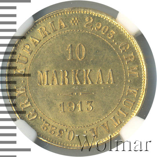 Динамика цен по монете 10 марок 1913 S „Для Финляндии“ MS10 марок 1913 года SДата выпуска: 01.01.1913 АверсВ центре изображён полный Герб Великого княжества Финляндского — двуглавый орёл, головы которого увенчаны двумя коронами, третья, большая корона над ними. Все они соединены орденской лентой ордена Св. Апостола Андрея Первозванного. На груди орла расположен щит с титульным гербом Великого князя Финляндского, увенчанный княжеской короной. Вокруг щита орденская цепь с орденом Св. Апостола Андрея Первозванного. В правой лапе орла — скипетр, в левой — держава. Под хвостом, справа, знак директора Гельсингфосского монетного двора — литера «S», Isak Gustaf Sundell (Исаак Густаф Сундель). Внизу, вдоль канта, полукругом надпись: «FINLAND SUOMI», разделённая стилизованной розеткой из семи точек. По окружности канта имеются рельефные элементы, выполненные в виде зубцов.РеверсВ центре слово «MARKKAA». Над словом указан номинал — цифра «10». Под словом расположен декоративный разделитель в виде двух разнонаправленных фигурных линий и точки между ними. Под разделителем — дата выпуска монеты «1913». Вокруг центрального изображения — витой ободок. За ободком круговая надпись: «2,903.GRM. KULTAA. 0,322.GRM. KUPARIA.», сверху разделённая стилизованной розеткой из семи точек. По окружности канта имеются рельефные элементы, выполненные в виде зубцов.Каталожные номера