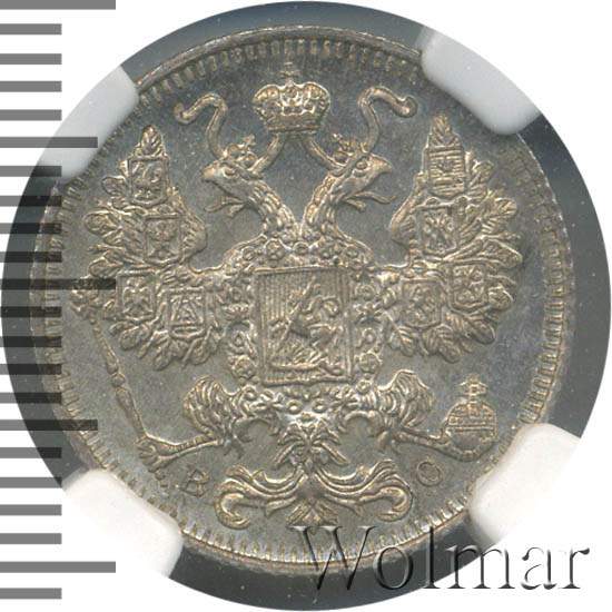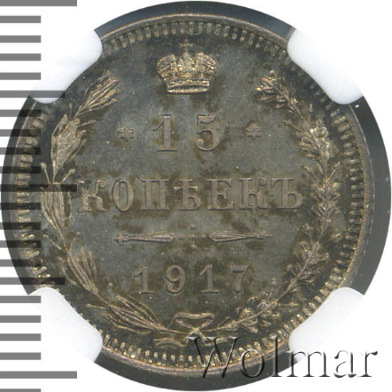 Динамика цен по монете 15 копеек 1917 ВС (Новый орел) PROOF15 копеек 1917 года ВСДата выпуска: 01.01.1917 АверсВ центре изображен Малый Государственный Герб Российской империи — двуглавый орёл, головы которого увенчаны двумя коронами, третья, большая корона над ними. Все они соединены орденской лентой ордена Св. Апостола Андрея Первозванного. На груди орла расположен Московский герб, в щите изображен Георгий Победоносец с копьем поражающий дракона. Вокруг щита цепь ордена Св. Апостола Андрея Первозванного. На крыльях изображены гербы: Царства Казанского, Польского, Херсонеса Таврического, Астраханского, Сибирского, Грузинского и герб соединенных княжеств Киевского, Новгородского и Владимирского — по 4 на каждое крыло. В правой лапе орла — скипетр, в левой — держава. Под правой лапой — буква «В», под левой — буква «С». Инициалы минцмейстера Виктора Смирнова. По окружности канта имеются рельефные элементы, выполненные в виде зубцов.РеверсВ центре указан номинал «15», ограниченный с обеих сторон звездочками. Над цифрой — Корона Российской империи. Под цифрой номинала — слово «КОПЕЕК». Ниже, расположен декоративный разделитель в виде двух разнонаправленных фигурных линий и стилизованным из точек крестом между ними. Под разделителем — дата выпуска монеты «1917». Вдоль канта, не доходя до короны, изображен венок из лавровой и дубовой ветви, которые в нижней части перевязаны лентой на узел бантом. По окружности канта имеются рельефные элементы, выполненные в виде зубцов.Каталожные номера