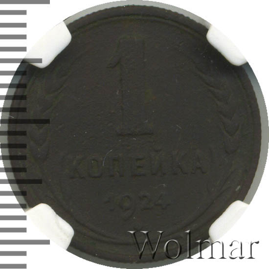 Динамика цен по монете 1 копейка 1924 - («СССР» вытянуты) „Гурт рубчатый“ MS1 копейка 1924 года (перепутка, аверс буквы «СССР» вытянуты, штемпель 1 от 20 копеек 1924 года)Дата выпуска: 01.01.1924 АверсШтемпель 1. 20 копеек 1924 года, буквы «СССР» вытянутые, герб СССР — 7 витков ленты РеверсШтемпель Ф-4 Каталожные номера