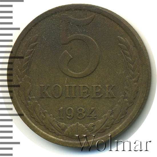 Разменные монеты номиналом 5 копеек 1961 - 1991Пятикопеечная монета времен позднего периода существования СССР изготовлена в виде кружка из медно-цинкового сплава. По периметру она имеет гладкую, выступающую с двух сторон окантовку. Все изображения и тексты возвышаются над основной плоскостью дензнака. Аверс. Как и у прочих монет низшего номинала, лицевая сторона пятикопеечной монеты украшена гербом Советского Союза и текстом под ним в виде аббревиатуры СССР. Реверс. Вдоль внешнего канта расположен венок, собранный из ветвей дуба и колосков пшеницы. Внутри него помещен номинал в виде цифры и букв (5 копеек), а также дата чеканки под ним. Гурт у монетки рубчатый. Диаметр круга составляет 25 мм. Номинальный вес — 5 грамм. Общий тираж выпуска превысил 1 миллиард экземпляров. Для чеканки использовалось несколько разновидностей штампов — только аверс встречается в четырех вариантах. |