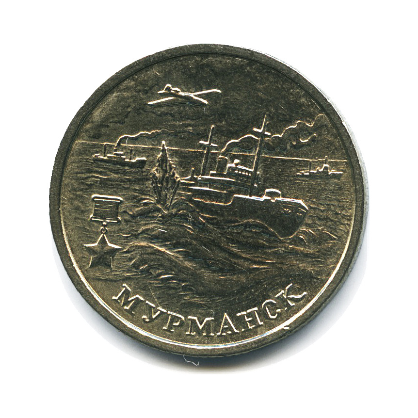 Динамика цен по монете 2 рубля 2000 ММД „Города-герои. Мурманск“ MSМурманск. 55-я годовщина Победы в Великой Отечественной войне 1941−1945 ггДата выпуска: 04.05.2000 Аверсв центре диска - обозначение достоинства монеты в две строки «2 РУБЛЯ», ниже — надпись: «БАНК РОССИИ», под ней — дата «2000», слева и справа — стилизованная ветка растения.Реверсдва транспортных судна морского конвоя, рядом с ними — фонтан взрыва, над ними — самолёт, слева — медаль «Золотая Звезда», справа — военный корабль, внизу по окружности — надпись: «МУРМАНСК».Каталожные номера