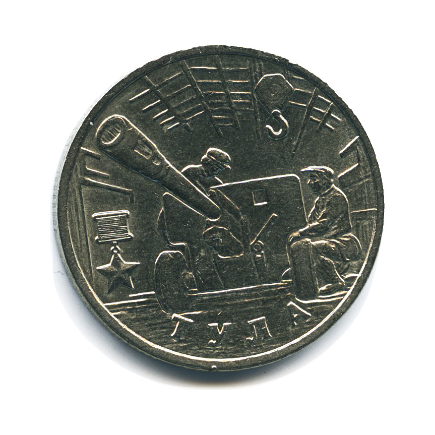 Динамика цен по монете 2 рубля 2000 ММД „Города-герои. Тула“ AUТула. 55-я годовщина Победы в Великой Отечественной войне 1941−1945 ггДата выпуска: 04.05.2000 Аверсв центре диска - обозначение достоинства монеты в две строки «2 РУБЛЯ», ниже — надпись: «БАНК РОССИИ», под ней — дата «2000», слева и справа — стилизованная ветка растения.Реверсдвое рабочих у пушки в заводском цеху, слева — медаль «Золотая Звезда», внизу по окружности — надпись: «ТУЛА».Каталожные номера